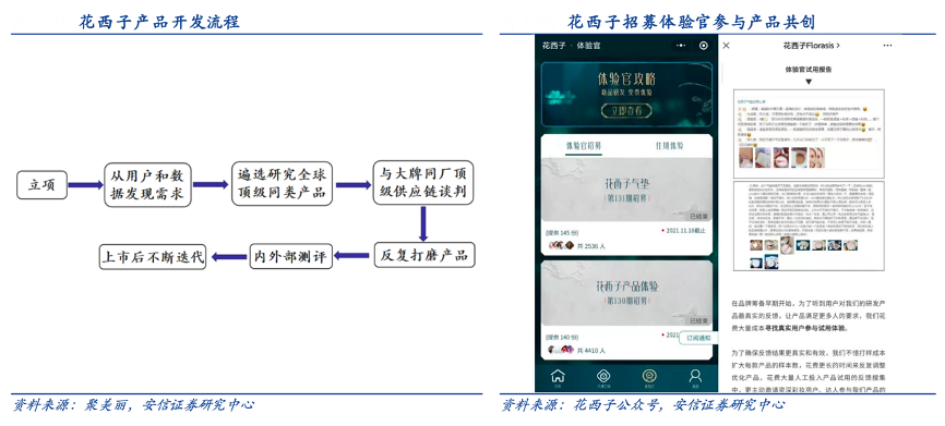 經(jīng)典案例:根據(jù)聚美麗、花西子公眾號、安信證券研究中心等綜合資訊表明,花西子在公眾號、微博、天貓店鋪等平臺發(fā)布體驗官招募信息,邀請用戶成為體驗館參與產(chǎn)品測評,反饋使用感受,截至 2021.11 已發(fā)布體驗官招募 131 期,每期申請人數(shù)在 1500-4500 人。通過實時跟進用戶反饋進行產(chǎn)品升級,四年里歷經(jīng)了眉筆 8 次迭代、蜜粉 4 次更新、眼 線筆 3 次升級,切實滿足消費者需要。