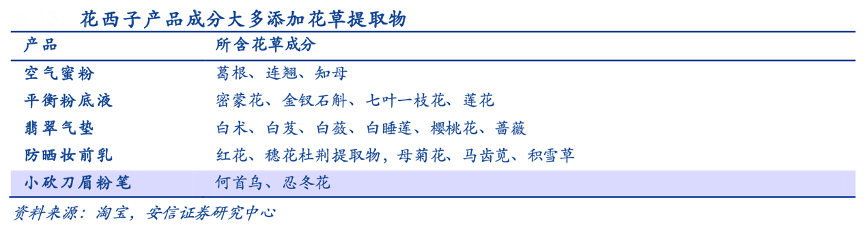 經(jīng)典案例:根據(jù)淘寶、安信證券研究中心等綜合資訊表明,花西子在外觀設(shè)計上均采用東方美學元素,包裝以黛色為基調(diào),將園林軒窗、同心鎖、傳統(tǒng)雕花工藝、百鳥朝鳳等元素運用于產(chǎn)品外觀中。同時其踐行“以花養(yǎng)膚”的理念,其產(chǎn)品成分大多添加了對皮膚有益的花草提取物,溫和養(yǎng)膚。例如蜜粉中添加葛根、連翹、知母等;口紅采用“花露胭脂”古方,添加上好花瓣;眉筆汲取“螺子黛”靈感,融入何首烏、忍冬花等成分,產(chǎn)品差異化突出。