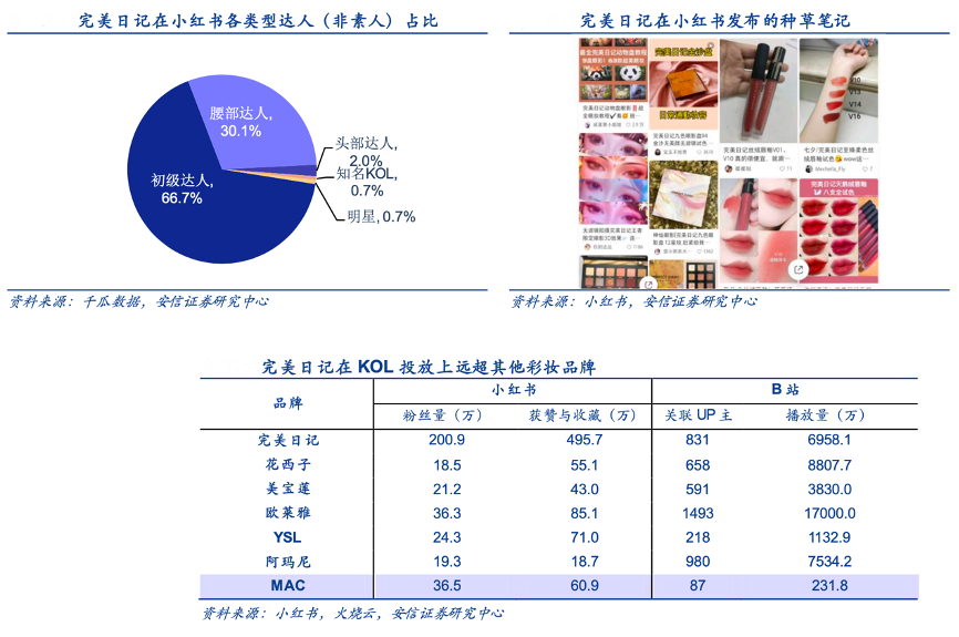 經典案例:根據千瓜數據、小紅書、火燒云、安信證券研究中心等綜合資訊表明,完美日記在 KOL 的選擇上采用“金字塔”結構,即少量明星和頭部 KOL(粉 絲數>50 萬)+中量腰部 KOL(粉絲數 5-50 萬)+大量初級 KOL(粉絲數<5 萬),頭部 KOL 提升品牌影響力,腰部和初級 KOL 配合度高、營銷費用較低卻也更拉近和消費者之間的距離。截至 2021 年 11 月,完美日記在小紅書擁有粉絲 200.9 萬,遠超其他彩妝品牌。