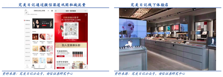 經典案例:根據完美日記公眾號、安信證券研究中心等綜合資訊表明,2018年完美日記開始運營微信商城,并鞏固私域流量,客戶在不同平臺購買商品后引導其掃碼關注公眾號、添加客服“小完子”并加入社群,與消費者建立更緊密的 溝通、提升復購率。根據公告,截至 2021 年底完美日記共有 252 家門店,預計到 2022 年共開設 600 家。線上線下全渠道整合,線上業務可以為線下體驗店帶來更多的客流量,而線下體驗店也為線 上平臺進一步引流。