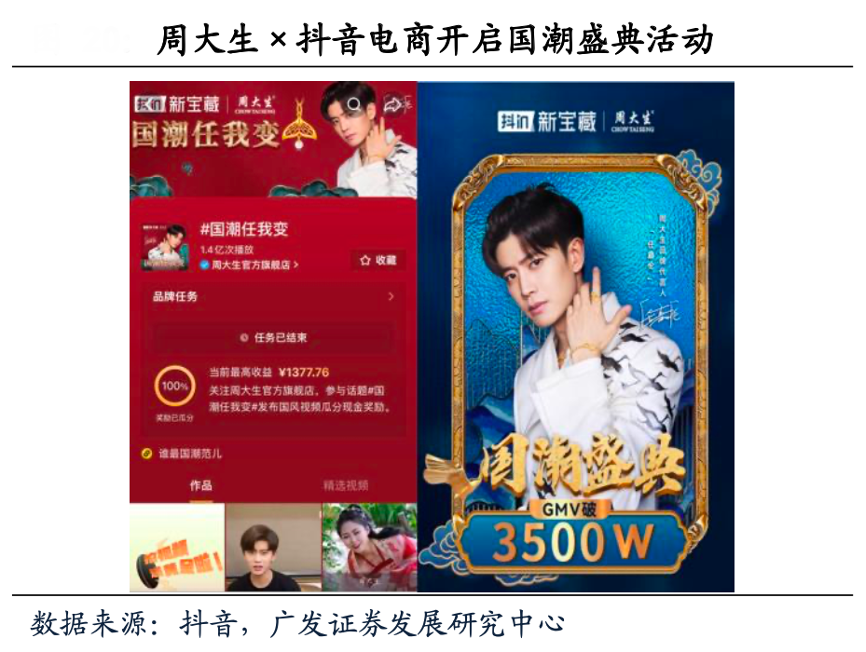 經(jīng)典案例:根據(jù)抖音、廣發(fā)證券發(fā)展研究中心等綜合資訊表明,周大生自2021年起布局“站外種草+平臺(tái)直播轉(zhuǎn)化+私域精細(xì)化運(yùn)營(yíng)”的年輕態(tài)營(yíng)銷戰(zhàn)略,發(fā)力抖音、小紅書等新興社交電商和興趣電商渠道;4月聯(lián)動(dòng)抖音電商“抖in新寶藏”開展國(guó)潮盛典活動(dòng),進(jìn)行總裁直播、達(dá)人直播,達(dá)成平臺(tái)聲量超2.2億,GMV 3500萬;“#國(guó)潮任我變”抖音話題曝光破1.2億,參與人數(shù)超3.1萬,店鋪粉絲增長(zhǎng)超16萬。