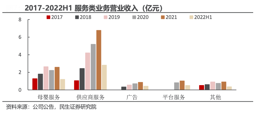 經典案例:根據公司公告、民生證券研究院等綜合資訊表明,孩子王公司在母嬰商品的基礎上提供母嬰服務,推出童樂園、互動活動、育兒服務等各類母嬰童服務及黑金會員服務,同時還與供應商合作,展開會員開發、互動活動冠名、商品線上線下推廣宣傳等活動,打造出差異化競爭力,2021年公司母嬰服務營收為 2.58 億元,yoy+16.38%;營收占比 2.85%, yoy+0.19pcts。