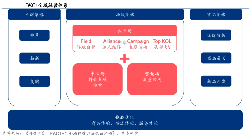 經典案例:根據《抖音電商“FACT+”全域經營方法論白皮書》、華泰研究等綜合資訊表明,2021 年 5 月,抖音電商推出 FACT 經營矩陣,通過陣地自營、主題活動、達人矩陣、頭部大 V 為品牌商提供四條內容創作賽道。2022年,抖音將以內容為中心的經營策略升級,將 FACT 作為賣家優質內容供給的保障,在此基礎上由抖音商城與搜索組成中心場,提供中心化(相對內容而言)的新的轉化領域。