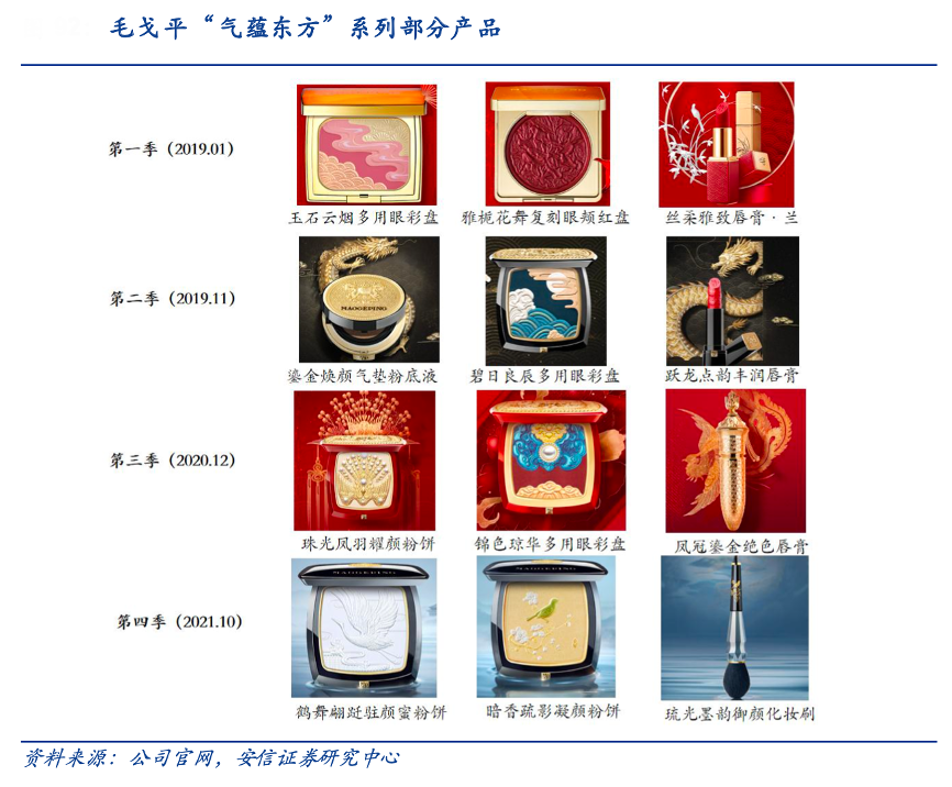 經典案例:根據公司官網、安信證券研究中心等綜合資訊表明,2019 年 1 月,MGPIN 與故宮合作推出 “氣蘊東方”系列,包含粉底、眼影、口紅、腮紅等共 32 個 SKU,產品名稱、包裝設計、壓粉圖紋均采用故宮藏品紋樣,極具東方韻味。