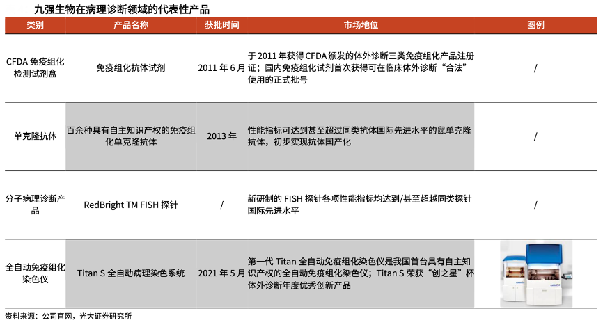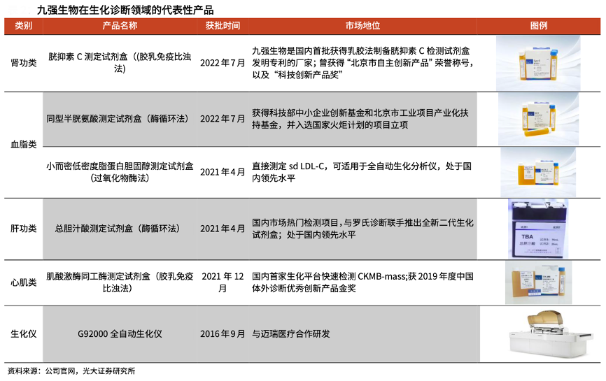 經典案例:根據公司官網、光大證券研究所等綜合資訊表明,自成立以來,九強生物公司始終致力于生化試劑的研發、生產和銷售,在生化領域占據國產第一梯隊。目前,公司主要診斷試劑種類有肝功類、腎功類、血脂類、心肌損傷、特種蛋白 和糖代謝類生化指標。公司率先在國內推出 HCY、胱抑素 C、生化同平臺檢測 PSA/fPSA、小而密低密度脂蛋白、CK-MB mass(生化平臺)等檢測項目。其中,胱抑素 C、同型半胱氨酸、小而密低密度脂蛋白膽固醇等高端診斷試劑處于國內領先水平。