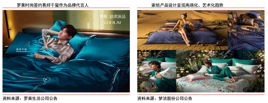 經典案例:根據羅萊生活公司公告、夢潔股份公司公告、中信證券研究部等綜合資訊表明,2022年羅萊生活簽約易烊千璽作為品牌代言人,持續向年輕化轉型;夢潔簽約前 LV 設計 總監 Vincent Du Sartel 為夢潔巴黎設計中心總監、簽約清華美院張寶華院長為夢潔國風美 學院院長、聯合香奈兒合作設計師 Marion Collet、愛馬仕設計師Sophie Meilichzon、非遺傳承人潘妍老師等頂尖設計資源,提升產品設計能力,對產品設計分場景、分功能精細運作。