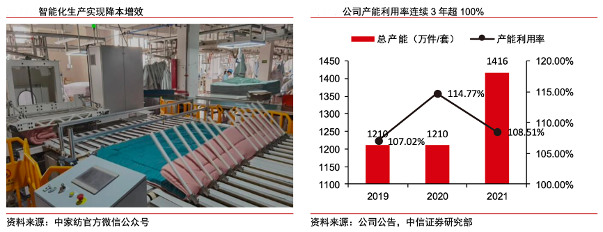 經(jīng)典案例:根據(jù)中家紡官方微信公眾號、公司公告、中信證券研究部等綜合資訊表明,羅萊公司積極發(fā)展智能制造,先后引進(jìn)德國 Mammut 多針絎縫機(jī),西班牙 MASIAS 梳理機(jī),瑞典 KINNA 智能分配、自動折疊設(shè)備等;通過機(jī)聯(lián)網(wǎng)開發(fā),實現(xiàn)繡花機(jī)的數(shù)字化和網(wǎng)絡(luò)化改造;并定制開發(fā)智能懸掛系統(tǒng)加強(qiáng)生產(chǎn)工序智能化管理。截至2021 年中,羅萊生產(chǎn)基地?fù)碛凶詣踊O(shè)備 2500 余臺,各品類全自動化吊掛(芯類、套件)流水線15條。