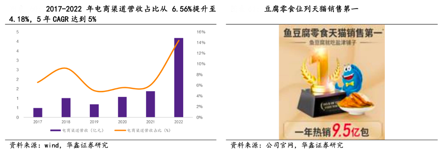 經典案例:根據wind、公司官網、華鑫證券研究等綜合資訊表明,鹽津鋪子從2020 年開始,線上電商聚焦“大單品戰略”,不斷加大傳統電商和社交渠道 的投入,抖音開設直播和達播,位列抖音電商零食店鋪熱銷榜第一,魚豆腐零食位列天 貓銷售第一。通過社交渠道傳播及種草,全面帶動其他電商平臺業務的高速增長。 2017-2022年電商渠道營收占比從 6.56%提升至 14.45%,5 年 CAGR 達到 53%。