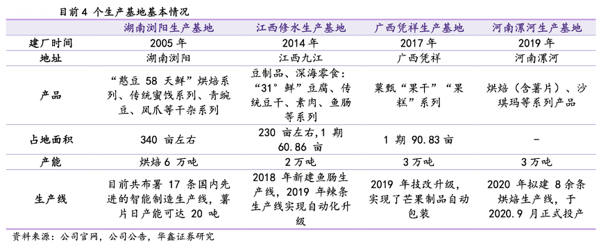 經典案例:根據公司官網、公司公告、華鑫證券研究等綜合資訊表明,鹽津鋪子公司目前在湖南瀏陽、江西修水、廣西憑祥、河南漯河共有 4 個生產基地,目前 產能充足,且四個基地已經儲備后續用地,產能按照下一個春節的最大日需求配置產 能,并且適當提前補足產能。2022 年,鹽津鋪子瀏陽生產基地建成生態智慧工廠、數 字化電商綜合倉庫、津匠豆制品基地項目、魔芋、薯片生產線等項目,新增生產線 20 條。