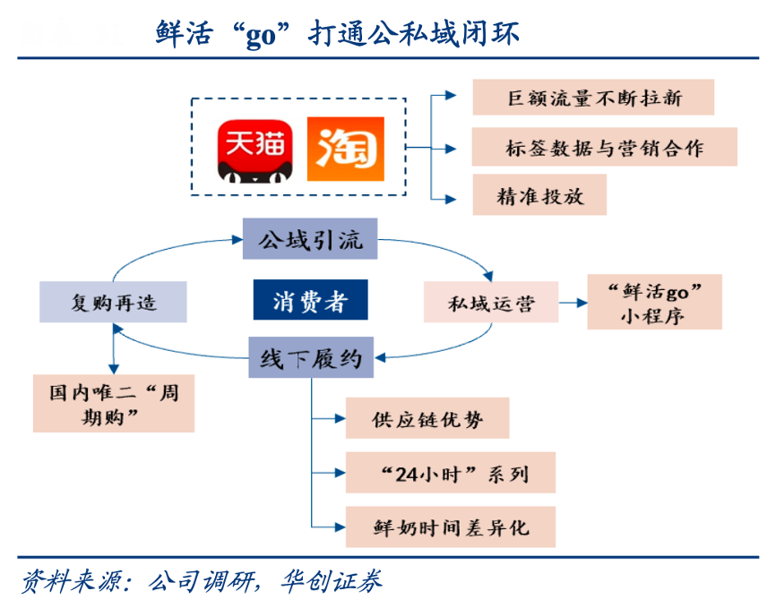 經典案例:根據公司調研、華創證券等綜合資訊表明,新乳業公司通過天貓、淘寶等平臺上的投放將公域流量引至“鮮活go”,并通過會員等私域運營方式完成用戶的留存和裂變,近年全域電商渠道快速增長,22H1 毛利亦回升至 25.9%。而線下的鮮生活門店起到品牌宣傳產品陳列作用,通過與烘焙等產品組 合實現更強引流。