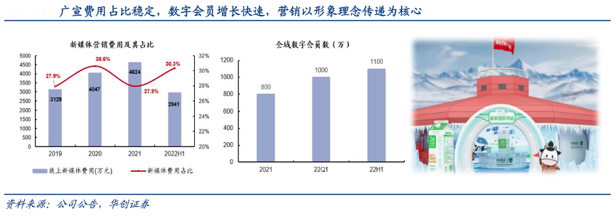 經典案例:根據公司公告、華創證券等綜合資訊表明,新乳業線上新媒體費用支出不斷提升,占廣宣費用比例較為穩定,2019-2022H1 均在 30%左右。截止 22H1,新乳業全域數字化用戶突破 1100 萬人,半年內新轉化超過300 萬全域數字會員。新乳業聯名中國極地科考隊,傳遞以“極質”的鮮活提供更好健康營養的理念,以“極地精神”強化公司精益求精的形象。2021年第八屆鮮奶節也以“極地”為主題,活動在微博整體曝光量超過 3,000 萬人次,閱讀量超過 1,800 萬人次。