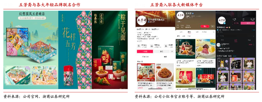 經典案例:根據公司官網、公司小紅書官方帳號、浙商證券研究所等綜合資訊表明,為了順應國潮趨勢、拓展在年輕消費者群體中的知名度,五芳齋選擇與各大品牌 IP 進行不同程度的跨界聯名:迪士尼、樂高、拉面說、王者榮耀、樂事、AKOKO、鐘薛高等,用新奇、好玩又富有中式韻味的國潮美食與 Z 世代建立溝通,為品牌注入新活力。同時五芳齋自 2009 年便積極布局電商渠道,現已成功應用短視頻、B 站、小紅書、H5等創新傳播方式與年輕人進行溝通,并通過更加年輕化的營銷內容,不斷開拓新一代的用戶群體。