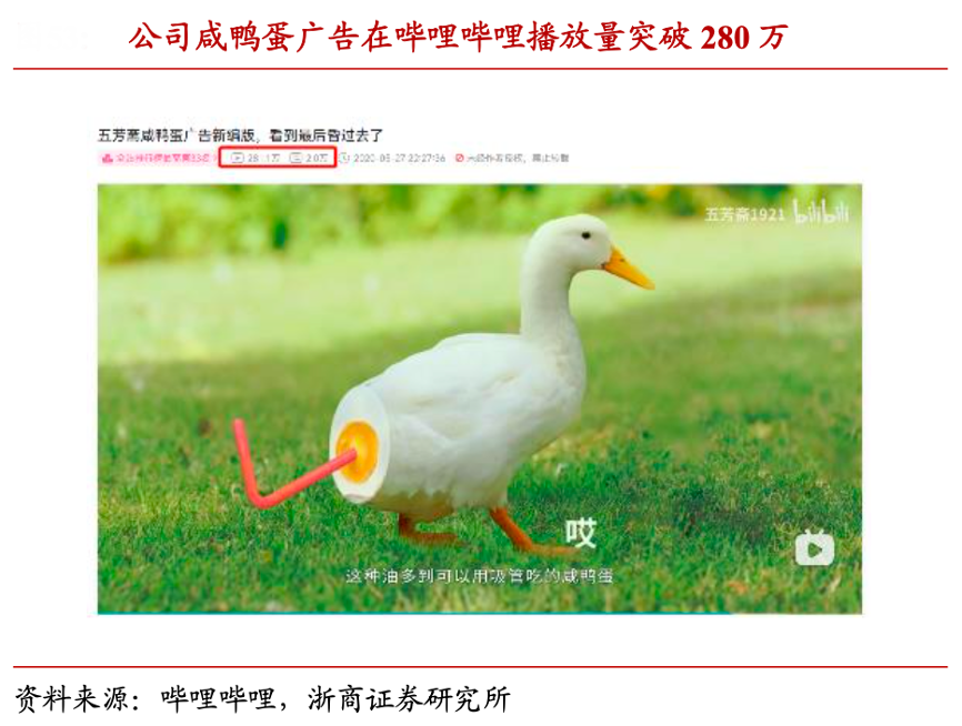 經典案例:根據嗶哩嗶哩、浙商證券研究所等綜合資訊表明,五芳齋咸鴨蛋產品擁有上乘養殖環境+農家地道傳統工藝兩大競爭優勢,且已通過在嗶哩嗶哩發布新穎廣告順勢破圈,吸引了一定的關注度。
