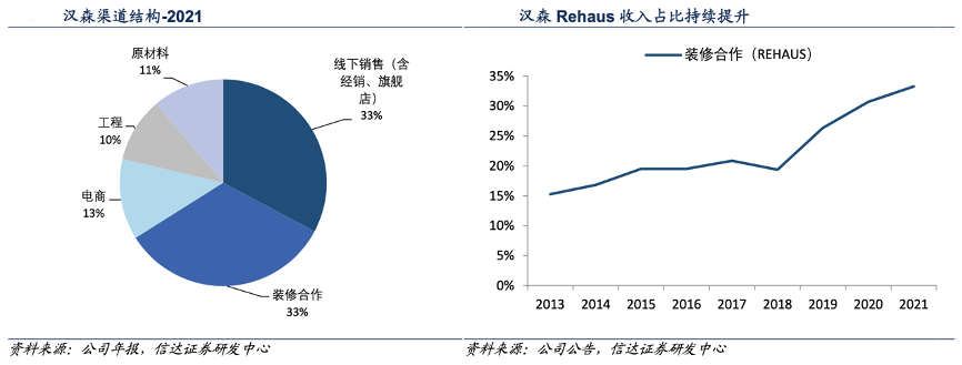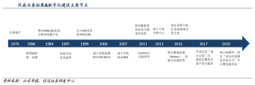 經(jīng)典案例:根據(jù)公司年報、公司公告、信達證券研發(fā)中心等綜合資訊表明,漢森成立于 1970 年,櫥柜起家,而后陸續(xù)拓展衣柜、室內(nèi)軟體家具以及家居小件等品類,其中櫥衣木質(zhì)家具由漢森自產(chǎn),其他家具品類以 OEM 或者和其他家具品牌合作銷售為主,通過客廳空間、臥室空間等多空間的展示以實現(xiàn)整體家居產(chǎn)品的銷售。2016年將 IK 部門升級為 Rehaus 整裝店,推出整裝產(chǎn)品套餐、加速整合裝修公司。2016 年以后,在韓國市場的地產(chǎn)周期下行的 背景下,Rehaus 仍實現(xiàn)逆勢增長,