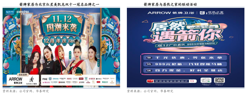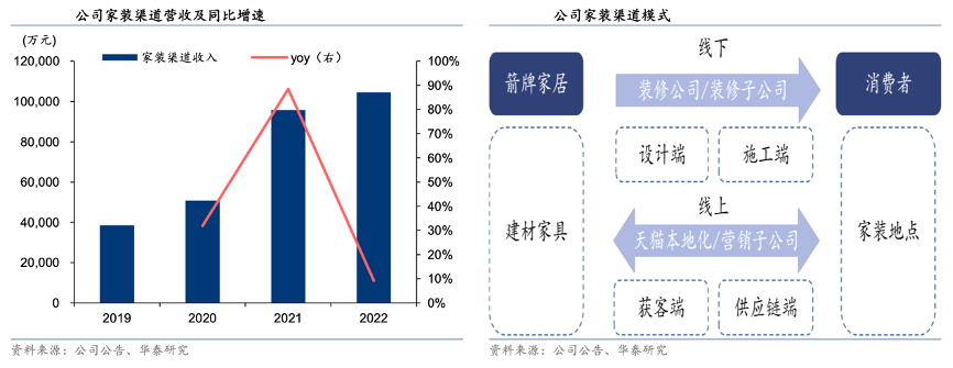 經(jīng)典案例:根據(jù)公司公告、華泰研究等綜合資訊表明,箭牌家居公司積極拓展家裝渠道,與全國性頭部家裝公司達成戰(zhàn)略合作并由各地經(jīng)銷商落地實施,同時,公司各區(qū)域服務(wù)人員協(xié)同經(jīng)銷商開展“家裝城市合伙人”等活動以開拓當(dāng)?shù)刂行∥⒓已b企業(yè),并提供專項產(chǎn)品方案。2022年,公司家裝渠道實現(xiàn)營收 10.5 億元,同比+9.2%;占總收入13.9%,同比+2.5pct。