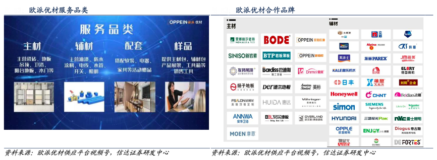 經典案例:根據歐派優材供應平臺視頻號、信達證券研發中心等綜合資訊表明,2021年7月,歐派優材公司推出一站式主輔材供應平臺“歐派優材”,以輕資產模式運行,核心戰略是為了讓消費者材料選擇簡單化、材料商經營便捷化、裝企協同交付輕松化,合作品牌包括東方雨虹、霍尼韋爾、西門子、三棵樹、雷士照明、巴迪斯、友邦、多樂士、施耐德、德高等頭部裝修材料品牌。