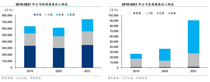 經(jīng)典案例:根據(jù)公司公告、華泰研究等綜合資訊表明,目前箭牌家居的銷售模式為經(jīng)銷為主,而經(jīng)銷模式以 C 端零售為主,2022年,公司經(jīng)銷渠道收入約 66 億元,同比下降11.0%,占總收入 88.0%。同時(shí)其打造出覆蓋零售、工程、電商、家裝等全渠道營銷體系,2022年零售/工程/電商/家裝渠道收入占比分別為41.4%/24.6%/20.1%/13.9%。
