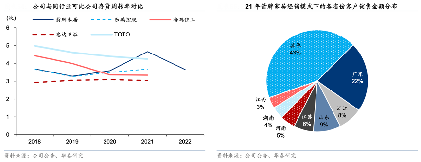 經(jīng)典案例:根據(jù)公司公告、華泰研究等綜合資訊表明,從區(qū)域來看,箭牌家居公司經(jīng)銷收入主要集中在華南廣東省,華東江浙兩省、山東省,以及華中河南省,2019-2021年間,上述五省經(jīng)銷收入分別占總經(jīng)銷收入46.37%、50.46%和 49.79%。 這五省的經(jīng)銷商數(shù)量也最多,主要原因是這五省經(jīng)濟(jì)較好,2021 年,上述五省也是國內(nèi)省份GDP 產(chǎn)值最高的 TOP5。