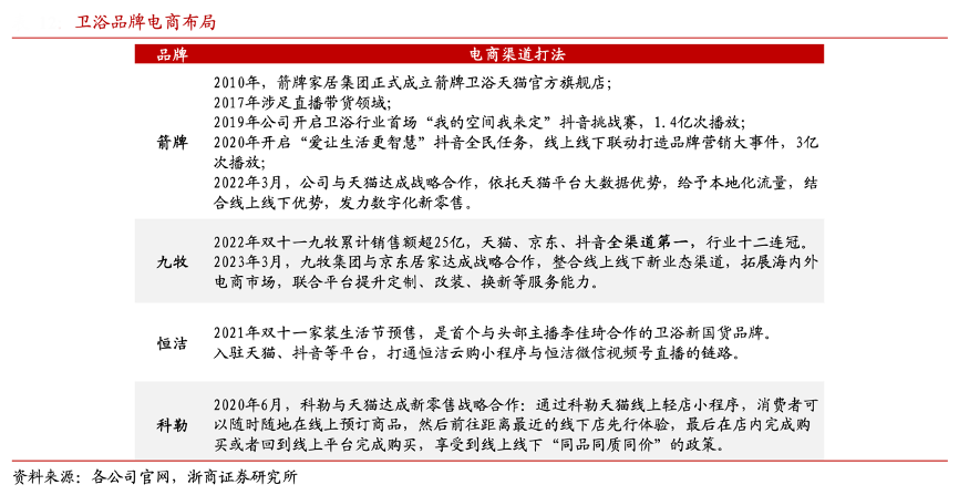 經典案例:根據各公司官網、浙商證券研究所等綜合資訊表明,箭牌早在 2010 年 成立天貓旗艦店,2017 年涉足直播帶貨,2019 年開啟衛浴行業首場抖音挑戰賽,目前天貓/京東/抖音粉絲數為 150/458/34 萬,電商由經銷商專營,配備專門的電商產品研發中心,線上專供產品占 80-90%。而九牧在三個平臺粉絲數都是最多的,且與第二名有翻倍身位差 距,目前天貓/京東/抖音粉絲數為 283/851/64 萬,線上專供產品占80%。
