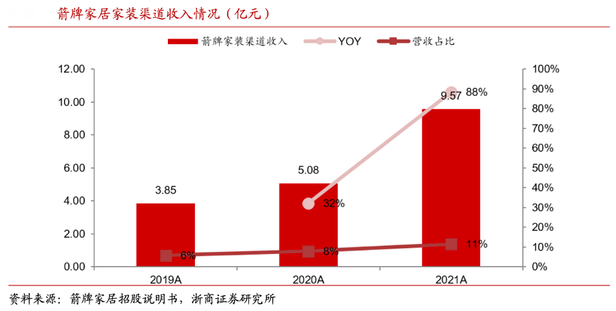 經典案例:根據箭牌家居招股說明書、浙商證券研究所等綜合資訊表明,家裝店提供一站式解決方案,受消費者青睞,各品牌與頭部裝企合作,采取開設家裝公司店中店模式,獲取家裝渠道流量。箭牌家居2021年家裝收入9.6 億元(+88.43%),12000個線下網點中有近 3000 家家裝店,家裝店是未來開店重心。
