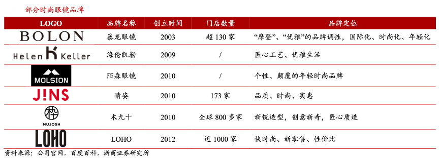 經典案例:根據公司官網、百度百科、浙商證券研究所等綜合資訊表明,眼鏡兼具裝飾屬性,時尚品牌紛紛入局。目前定位于時尚的眼鏡品牌較多,既有強調“品質”、“優雅”的高端時尚品牌暴龍眼鏡、海倫凱勒等,也有迎合年輕人個性潮流品味的快時尚品牌木九十、LOHO 等。時尚品牌的定位更加呈現多元化與差異化求。