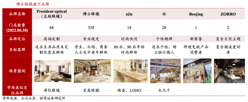 經典案例:根據公司公告、浙商證券研究所等綜合資訊表明,博士眼鏡重點發力“專業+高端”核心品牌門店。公司緊跟消費趨勢的變化,針對不同目標客 群目前已建立起 6 大眼鏡零售品牌。公司旗下核心品牌“博士眼鏡”和“總統眼鏡”著眼于中高端消費群體,截至 2022 上半年,公司已開設 338 家博士眼鏡品牌門店和 68 家總統眼鏡品牌門店,在門店總數中占比 83%。