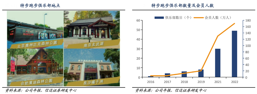 經典案例:根據公司年報、信達證券研發中心等綜合資訊表明,特步公司開設特步跑步俱樂部,部分特步跑步俱樂部設立于跑步熱門地點,包括北京奧林匹克森林公園、上海世紀公園、南京玄武湖等,成為公司的戰略優勢資源。截至 2022年,特步跑步俱樂部數量達 49 家,特跑族會員達約 170 萬,是國內規模最大、最活躍的品牌跑團。