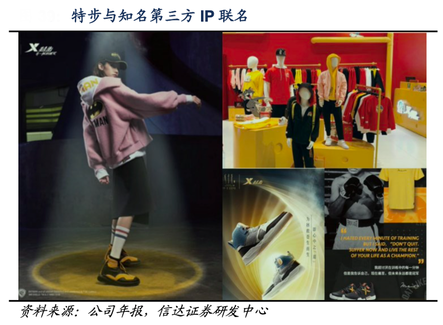 經典案例:根據公司年報、信達證券研發中心等綜合資訊表明,特步公司注重娛樂營銷推廣,采用聯名方式打通和拓寬受眾群體。2020年公司與中國內地最賣座的動畫電影之一《姜子牙:一戰封神》合作,以電影角色神話人物為主要設計靈感,推出跨界系列產品,將中國傳統文化融入現代時尚運動服裝中,在各類社交媒體平臺上不斷創造出熱門話題,深受年輕人喜愛。