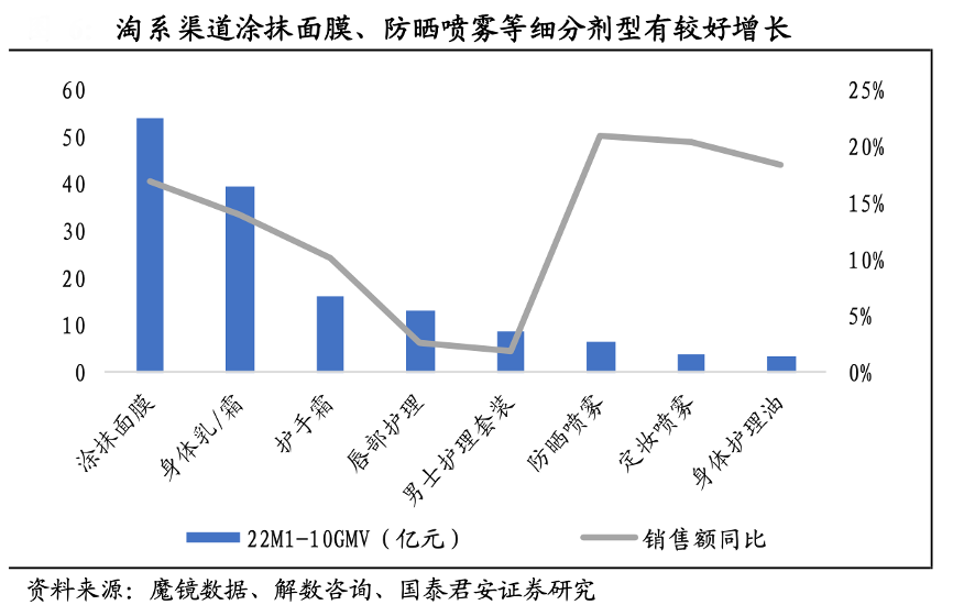 經(jīng)典案例:根據(jù)魔鏡數(shù)據(jù)、解數(shù)咨詢、國泰君安證券研究等綜合資訊表明,淘系大盤整體承壓下,涂抹面膜、防曬噴霧、定妝噴霧、身體油等產(chǎn)品仍有較好 增長,通過劑型、質(zhì)地、功效、針對部位等創(chuàng)新獲得增量。