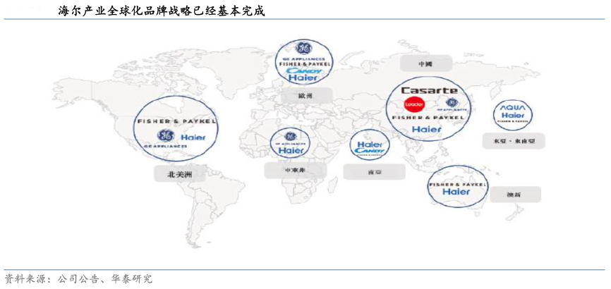 經典案例:根據公司公告、華泰研究等綜合資訊表明,隨著歐洲市場 Candy 品牌加入海爾海外品牌矩陣,海爾多層次品牌體系基本成型,其旗下 擁有海爾、美國 GE、意大利 Candy、新西蘭 Fisher&Paykel、自創高端品牌Casarte 和統 帥這五個主要品牌。其中,新西蘭 Fisher&Paykel 定位頂尖人群,主打奢華體驗;美國 GE 面向中產以上家庭,主打精英風格的家用電器等。