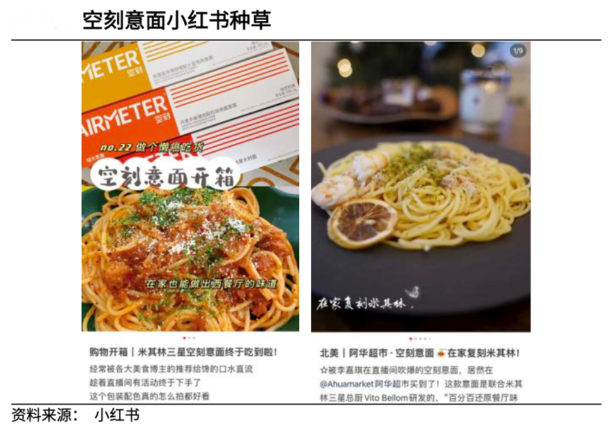 經典案例:根據小紅書、光大證券研究所等綜合資訊表明,空刻意面目標用戶定位職場白領、寶媽、涂口紅的女孩等追求生活品質的 Z 世代消費群體,這類人群也經?;钴S在小紅書、抖音等社交平臺,空刻在其中進行種草營銷,加強與“15 分鐘米其林大餐”、“星級意面”的關聯度,精準曝光。
