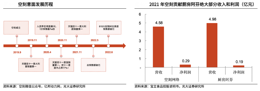 經典案例:根據空刻微信公眾號、億邦動力網、寶立食品招股說明書、光大證券研究所等綜合資訊表明,空刻成立于 2019 年 9 月,創立后連續 3 年成為天貓雙十一意面銷量第一,2022 年 5 月總銷售額破億,618 大促期間全渠道銷售額破億,上市以來一直保持著高速增長。2021年空刻網絡實現營收 4.58 億元,凈利率 6.2%,高于廚房阿芬整體凈利率 3.9%。