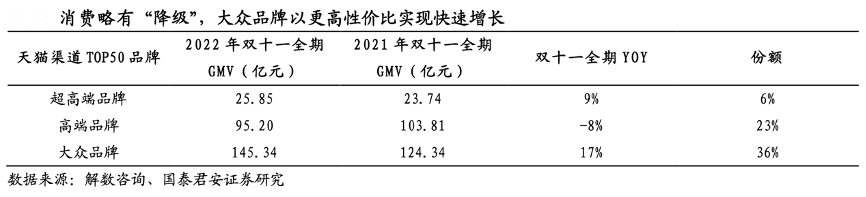 經(jīng)典案例:根據(jù)解數(shù)咨詢、國泰君安證券研究等綜合資訊表明,分品牌定位看,2022 年雙十一天貓 TOP50 品牌中超高端、高端、大眾品牌 GMV 同比+9%、-8%、+17%。在消費(fèi)環(huán)境和消費(fèi)力整體偏弱下,分層現(xiàn)象明顯,大眾品牌憑借更高性價(jià)比表現(xiàn)好于高端、超高端,超高端品牌客群購買力更為穩(wěn)定+強(qiáng)品牌力下通過折扣拉新,維持較快增長,而高端品牌整體出現(xiàn)頹勢。