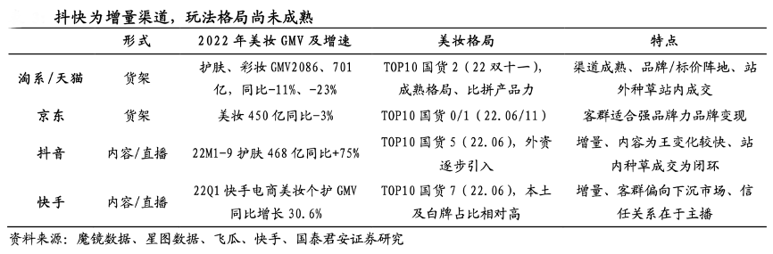 經典案例:根據魔鏡數據、星圖數據、飛瓜、快手、國泰君安證券研究等綜合資訊表明,平臺方面,據星圖數據,2022 雙十一綜合電商、直播電商 GMV 同比+3%、+146%,抖音、快手等直播電商通過內容觸達-直播成交閉環優化渠道效率迅速崛起表現顯著好于傳統貨架電商,但直播電商的內容屬性也使得運營標準化天然較貨架電商低,各品牌盈利能力高度分化。