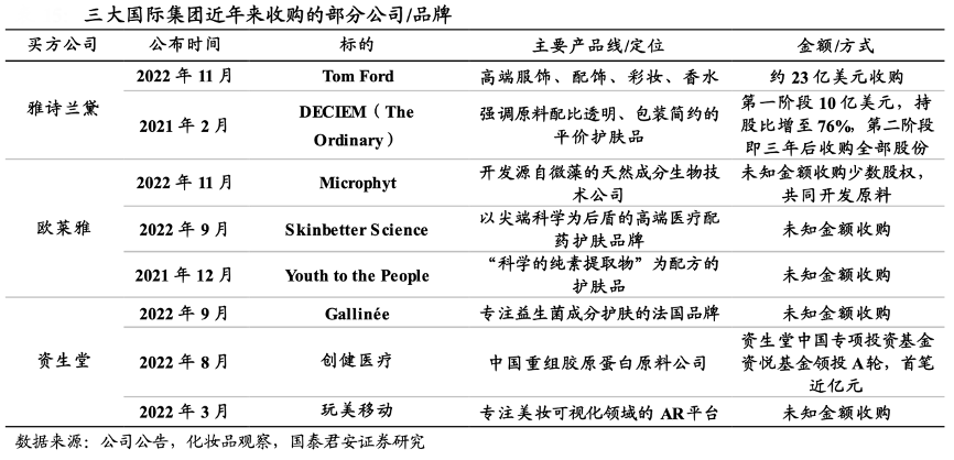 經典案例:根據公司公告、化妝品觀察和國泰君安證券研究等綜合資訊表明,2022年各大國際美妝巨頭同樣面臨增長放緩的壓力,投資并購有所加速,重點案例包括雅詩蘭黛斥資約 23 億美元收購 Tom Ford;歐萊雅收購小眾特色品 牌 Skinbetter Science、Youth to the People,同時投資從事原料研究的生 物技術公司 Microphyt。