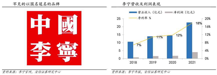 經典案例:根據李寧官網、李寧年報、安信證券研究中心等綜合資訊表明,與安踏的多品牌運營模式不同,李寧選擇了單品牌多子系列的運營模式實現各大運動品類的覆蓋,選擇單品牌運營的原因是李寧品牌從成立之初有“體操王子”李寧的名氣加持,具有成為國貨代表的先天優勢。自 2018 年推出“中國李寧”,李寧營收和2018-2021年營收增長達到 115%,凈利率也持續提高至 2021 年的18%。
