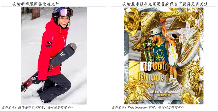 經典案例:根據微博安踏官方帳號、Klaythompson官網、安信證券研究中心等綜合資訊表明,從體育圈看,安踏在 2019 年便 簽下谷愛凌,隨著谷愛凌獲得中國代表團史上第一枚冬奧會金牌,谷愛凌迅速在社交媒體霸榜,其穿著的安踏羽絨服也登上微博熱搜榜,安踏在冰雪服裝的品牌影響力迅速提高。除了冰雪項目,安踏也長期布局籃球市場,主要聚焦 NBA,并與球星克萊湯普森在 2015 年開始合 作推出簽名鞋,如今已更新到第八代。