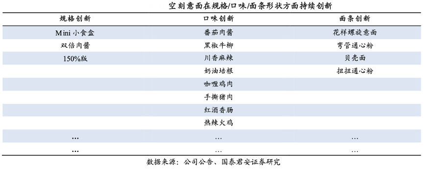 經(jīng)典案例:根據(jù)公司公告、國泰君安證券研究等綜合資訊表明,聚焦意面,空刻公司持續(xù)補(bǔ)齊自身產(chǎn)品矩陣,持續(xù)發(fā)揚(yáng)寶立的優(yōu)勢,不斷推出中西方口味混合等創(chuàng)新類產(chǎn)品。
