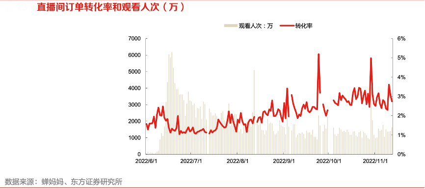 經典案例:根據蟬媽媽、東方證券研究所等綜合資訊表明,從東方甄選直播間的轉化率來看,效果顯著,即使考慮到觀看人次在 9 月開學之后下降,依然看到直播間內整體轉化率的提升,從 7 月份的 1%提 升到 10 月末的 3%左右。