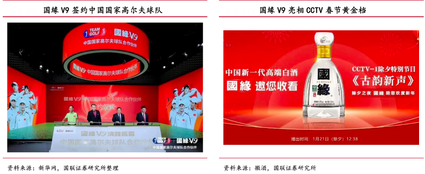 經(jīng)典案例:根據(jù)新華網(wǎng)、徽酒、國(guó)聯(lián)證券研究所等綜合資訊表明,V 系作為國(guó)緣高線產(chǎn)品,公司注重 V9 的高規(guī)格媒介傳播和高端事件營(yíng)銷。新華社民族品牌工程、“國(guó)緣 V9”號(hào)衛(wèi)星、簽約國(guó)家高爾夫球隊(duì)、CCTV 春節(jié)黃金檔等營(yíng)銷活動(dòng)都以 V9 作為宣傳產(chǎn)品,通過頻繁的高規(guī)格媒介露出、對(duì)接高端資源,提升品牌調(diào)性。
