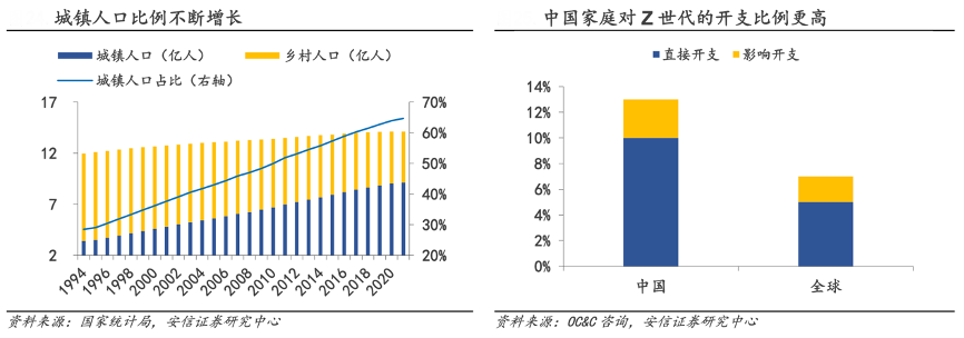 經(jīng)典案例:根據(jù)國(guó)家統(tǒng)計(jì)局、OC&C咨詢、安信證券研究中心等綜合資訊表明,Z 世代所代表的 1995-2009 年 是我國(guó)經(jīng)濟(jì)騰飛及人民生活水平大幅提升的主要階段,其在城鎮(zhèn)出生長(zhǎng)大的比例高,家庭環(huán)境總體而言較為殷實(shí),家庭支出中更愿意為在 Z 世代上消費(fèi)。根據(jù) OC&C 的咨詢報(bào)告,中國(guó)家庭 13%的開(kāi)支投入在了 Z 世代,高于全球 7%的平均水平。