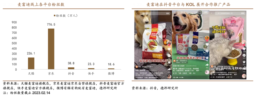 經典案例:根據天貓麥富迪旗艦店、京東麥富迪京東自營旗艦店、抖音麥富迪官方旗艦店、快手麥富迪官方旗艦店、微博有貓有狗就有麥富迪、抖音、德邦研究所等綜合資訊表明,截至 2023 年 2 月 14 日乖寶公司在天貓、京東、抖音、快手平臺旗艦店粉絲數分別為 226.1 萬、776.5 萬、38.8 萬和 23.3 萬。另外公司積極推進 KOL 孵化項目,通過與 Bilibili、小紅書、抖音、快手等平臺 KOL 的內容合作,培育品牌 KOL 矩陣,以日常廣告和新品種草的形式推廣產品。目前抖音等新興電商獲效 顯著,22H1 公司抖音平臺(直銷)同比增長 1183%,拼多多平臺(直銷)同比增 長 786%。