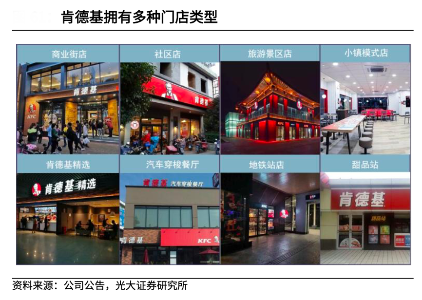 經典案例:根據公司公告、光大證券研究所等綜合資訊表明,目前肯德基提供 了四種門店模式(標準店、Future store、Mini 店及下沉市場餐廳)及多種功能模塊(To Go、肩并肩、咖啡車、小站等),這些模塊根據需求可以靈活組裝在任 何一種新店模式之上。百勝中國積極探索拓店新模式,開設更多小型餐廳控制成本,從盈利模型看,小店投入更小、回收期更短、利潤率更高。