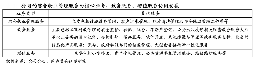 經典案例:根據公司公告、國泰君安證券研究等綜合資訊表明,特發服務公司已形成綜合物業管理服務(IFM)為核心,政務服務、增值服務協同發展的經營模式,營收占比分別為 82%、12%、6%。綜合物業管理服務為公司的成熟型業 務,目前已覆蓋高 新科技園區、商業綜合體、政府機關、學校、醫院等多種類型的物業。