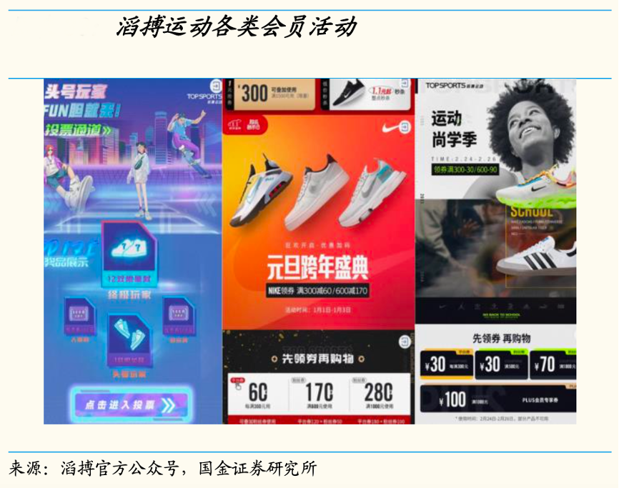 經典案例:根據公司公告、國金證券研究所等綜合資訊表明,截至 2022 年 2 月,滔搏公司會員人數突破 5550 萬人,單季度會員貢獻店內超過 96.4% 的零售總額,且 30%的會員曾消費 2 個及以上品牌。通過對數千萬會員持續有效的運營和服務,滔搏早已超越品牌銷售中間商的角色,逐漸發展成為國內最大的運動服務平臺之一。