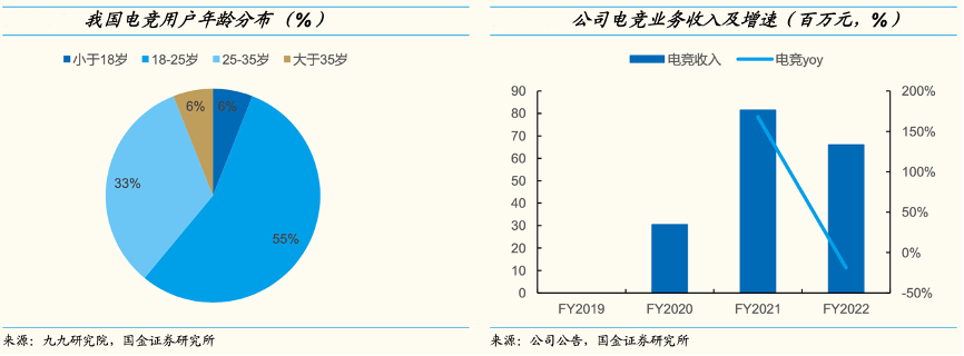 經(jīng)典案例:根據(jù)九九研究院、公司公告、國(guó)金證券研究所等綜合資訊表明,電競(jìng)用戶中 66%為男性,35 歲及以下用戶占比高達(dá) 94%,而電競(jìng)項(xiàng)目具有部分競(jìng)技體育的屬性,因此與公司的核心客戶群體高度重合。2017 年 12 月公司正式進(jìn)軍電競(jìng)領(lǐng)域,組建滔搏電子競(jìng)技俱樂(lè)部(TES),F(xiàn)Y22 年公司電競(jìng)業(yè)務(wù)實(shí)現(xiàn)收入 0.66 億元。
