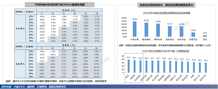 經(jīng)典案例:根據(jù)開(kāi)曼4000、搜狐網(wǎng)、艾瑞咨詢、國(guó)海證券研究所等綜合資訊表明,社區(qū)團(tuán)購(gòu)致力于提升單價(jià)/毛利率措施—品類(lèi)結(jié)構(gòu)全域化,滿足不同消費(fèi)場(chǎng)景:1)家庭生活需求延伸到生產(chǎn)需求,比如農(nóng)資化肥;2)快消品延伸到耐用消費(fèi)品,比如空調(diào)、冰箱、洗衣機(jī)等; 3)消費(fèi)型購(gòu)買(mǎi)延伸到批發(fā)型購(gòu)買(mǎi),比如雞蛋品類(lèi)的論大筐賣(mài),小店的補(bǔ)充型進(jìn)貨。社區(qū)團(tuán)購(gòu)始于家庭場(chǎng)景,但始終圍繞用戶需求,延伸至出行/旅游/辦公,力求滿足一站式購(gòu)物需求。