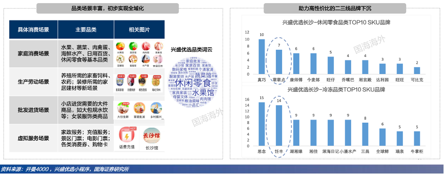 經(jīng)典案例:根據(jù)開(kāi)曼4000、興盛優(yōu)選小程序、國(guó)海證券研究所等綜合資訊表明,興盛優(yōu)選在湖南深耕多年,率先在品類(lèi)上打破家庭消費(fèi)場(chǎng)景,實(shí)現(xiàn)全域化覆蓋,自然延伸到生產(chǎn)、批發(fā)等場(chǎng)景,比如售賣(mài)生產(chǎn)所需的飼料、批發(fā)所需的大件商品(大筐雞蛋等)、虛擬服務(wù)商品(景區(qū)電影票、各類(lèi)消費(fèi)券等)、裝修所需的家居建材等,深度匹配下沉區(qū)域用戶需求,提高平臺(tái)用戶粘性。