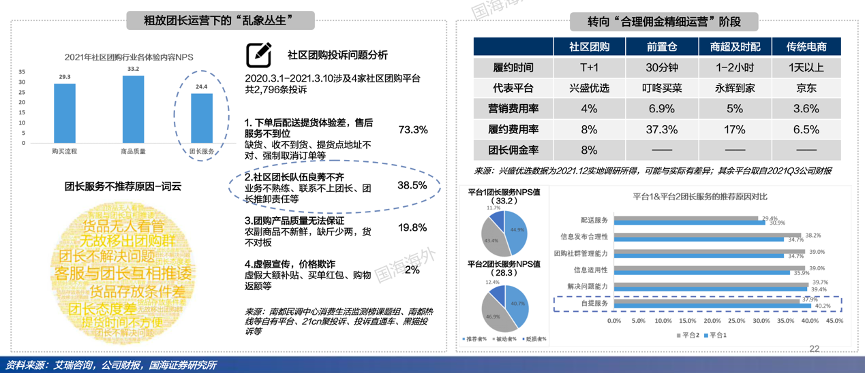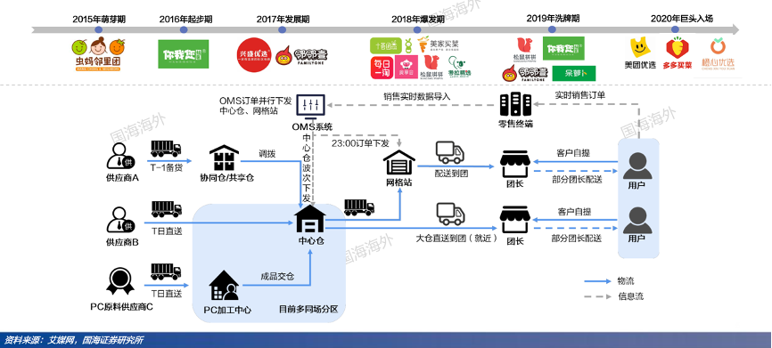 經典案例:根據艾媒網、國海證券研究所等綜合資訊表明,社區團購是依托于社區和團長資源進行商品流通的一種新型零售模式,本質是渠道創新下的新零售,并通過互聯網流量和運營玩法來賦能。兩大特點突出:1)“預售(去庫存)+自提(降履約成本&線下引流)+次日達(集采降本)”;2)半熟人社交,團長為關系紐帶(降獲客成本);3)區域化、本地化屬性強。