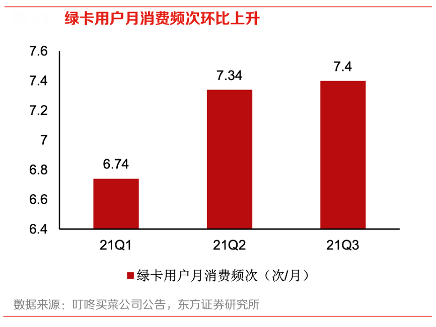 經典案例:根據叮咚買菜公司公告、東方證券研究所等綜合資訊表明,從業務數據來看,其綠卡用戶的消費頻次21Q2 明顯上升,且高于用戶平均消費頻次。21Q2 叮咚買菜綠卡會員消費頻次達到 7.34 次/月,顯著高于用戶平均消費頻次,環比增加 0.6 次,有明顯提升。